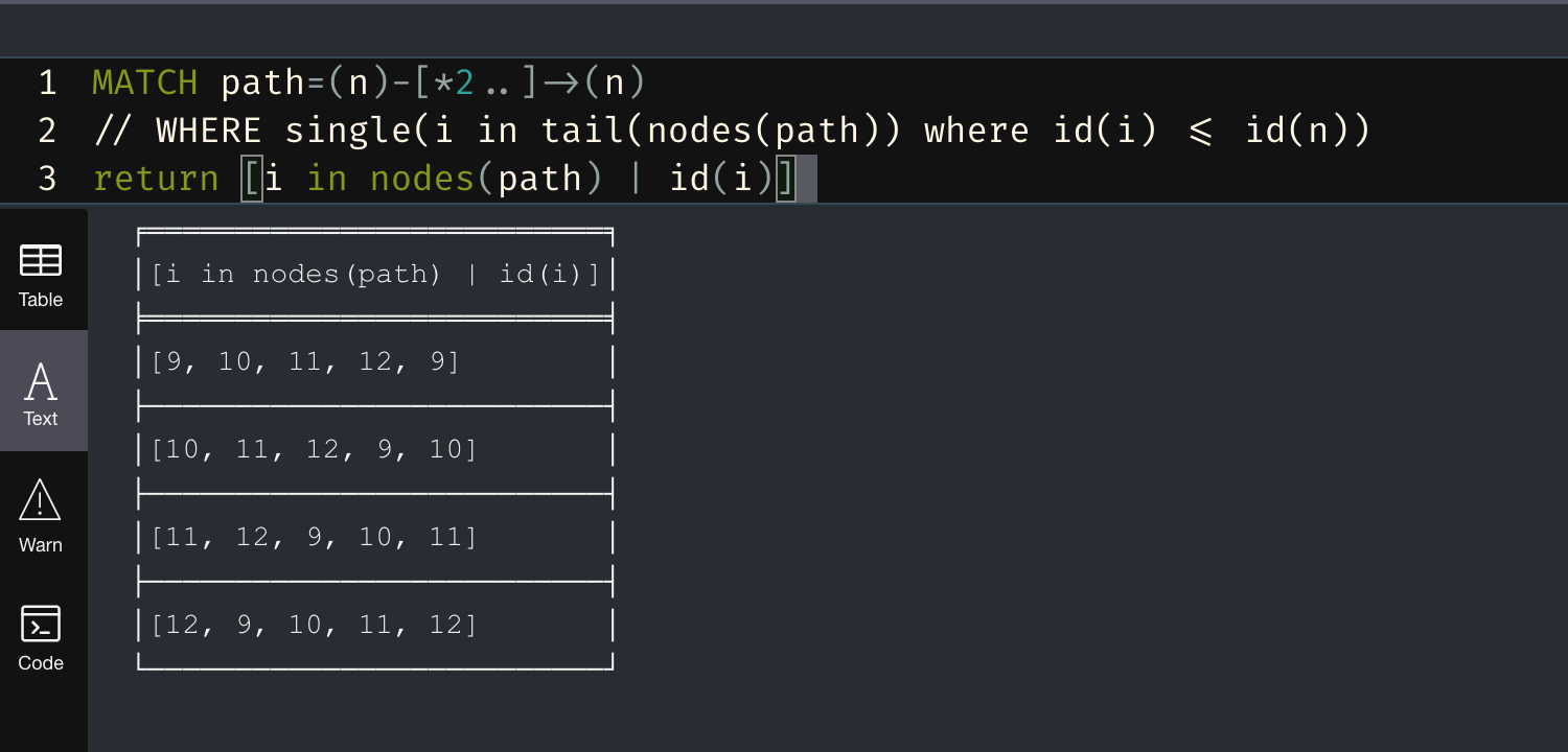 MATCH path=(n) ( (pre)-[]->(post WHERE id(pre) <= id(post)) )+ ()-[]->(n)