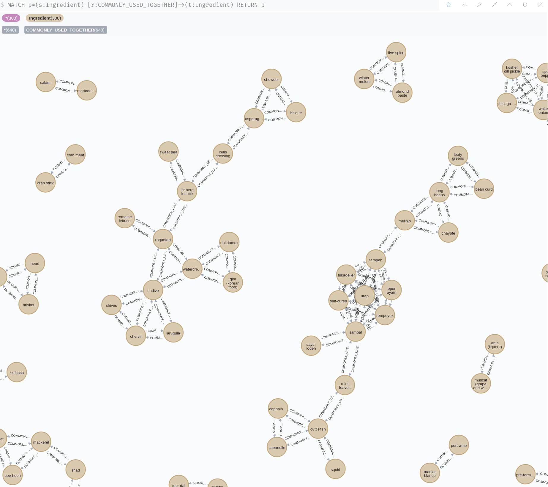 MATCH p=(s:Ingredient)-[r:COMMONLY_USED_TOGETHER]->(t:Ingredient)
