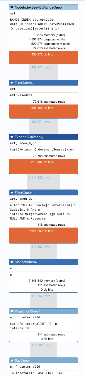 This helped a bit but it's still pretty dire by comparison: planner: COST, runtime: PIPELINED. 34836518 total db hits in 25676 ms.